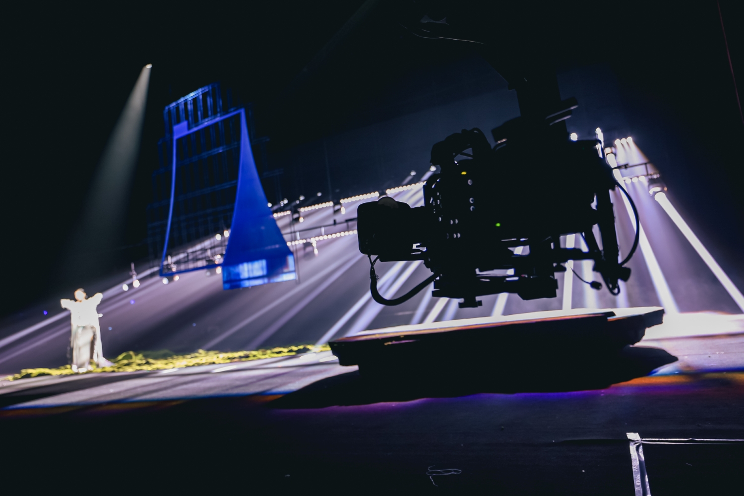 整场音乐会共部署了七个讯道化机位。主机位位于中央观众席后方,负责整体构图与舞台全景;两侧机位聚焦演员与舞者的情绪特写;轨道机位沿舞台前沿移动,用于捕捉节奏变化;摇臂机位提供俯拍与空间透视;另有观众区与远距长焦机位负责氛围与纵深的捕捉。