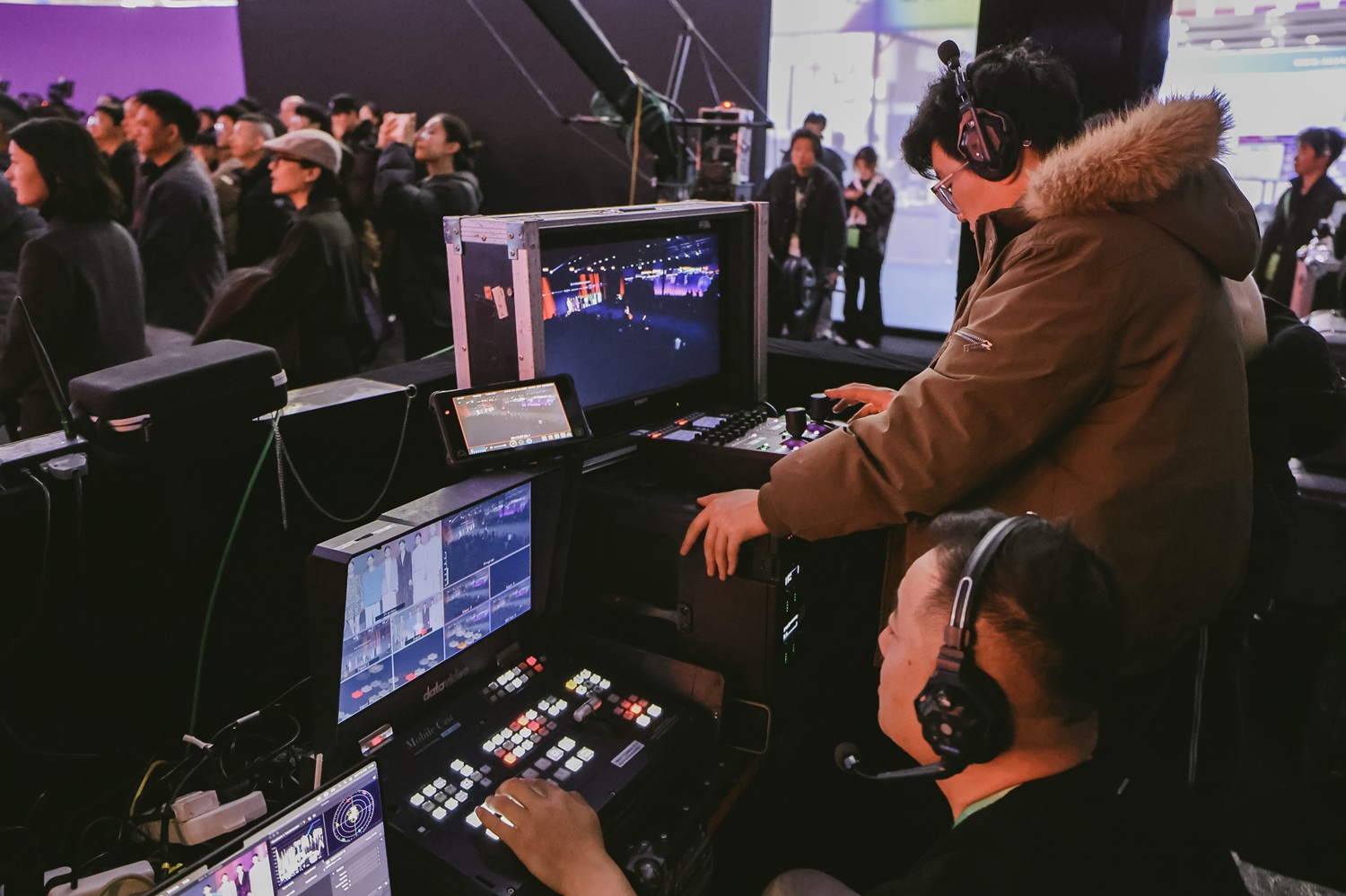 今年的方案升级,关键在于将电影机正式纳入系统性的讯道化架构。针对大型秀场机位分散的部署需求,“佳直播PRO”为佳能EOS C400配套光传模块与控制单元(CCU),通过单根光缆整合视频信号、返送、对讲与供电,使机位能够更灵活地部署在摇臂等特种云台上。后台配合控制面板进行参数微调,确保多机位曝光一致并提升现场响应效率。导播端也因此获得更稳定的画面一致性与PGM(Program,最终画面输送信号)可控性。这种集中控制让分工更清晰:摄影师专注构图与跟随,后台统一参数与色彩,导播把节奏控得更稳,团队执行更顺畅,最终输出更连贯、更具整体感的直播画面。