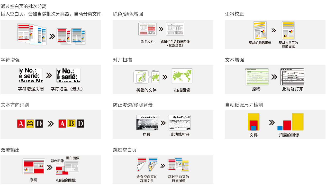 护照扫描,双张送入解除功能等,通过空白页的批次分离,除色/颜色增强,歪斜校正,字符增强,对开扫描,文本增强,文本方向识别,防止渗透/移除背景,自动纸张尺寸检测,双流输出,跳过空白页等图像处理功能。