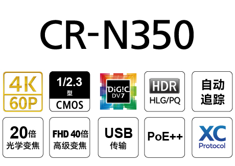 CR-N350搭载了佳能高画质4K影像系统和1/2.3型CMOS影像传感器,可支持4K 60P高清影像输出,兼具广角和20倍光学变焦的摄像镜头和一个高性能影像处理平台DIGIC DV 7,新增IP视频裁切和竖屏裁切,可满足直播电商、智能手机的观看需求;实现0.1度/秒的低速平滑PT驱动,可进行平滑的PTZ操作;内置应用的组合与第三方设备的兼容性,大幅提高操作效率,广泛适用于业余体育、企业活动、在线讲座、会议收录制作等场合。