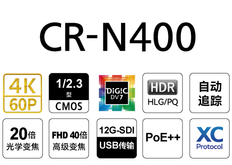 CR-N400搭载了佳能高画质4K影像系统和1/2.3型CMOS影像传感器,可支持4K 60P高清影像输出,兼具广角和20倍光学变焦的摄像镜头和一个高性能影像处理平台DIGIC DV 7,新增竖屏裁切,可满足直播电商、智能手机的竖屏观看需求;实现了0.1度/秒的低速平滑PT驱动,可进行平滑的PTZ操作;支持12G/3G-SDI端口,可根据制作需求实现多种输出方式;广泛适用于体育赛事、真人秀、舞台拍摄、在线讲座、专业摄影摄像记录等场合。