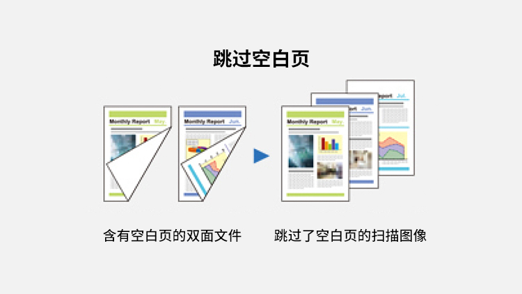 当扫描的一批文档中同时包含单面和双面文档时,此功能非常有用,可自动从图像数据中删除空白页,从而减小了文件大小。