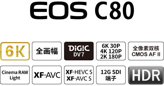 EOS C80延续了CINEMA EOS数字电影机出色的高画质与专业视频功能,沿袭了EOS C70的高机动性、小巧轻便设计。将视频功能全面升级,扩展了输入及输出端子,可用于VR拍摄、虚拟制作等用途。