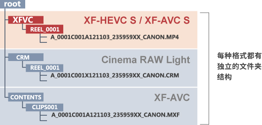 在XF-HEVC S / XF-AVC S格式下,文件夹结构不同于以往的MP4格式,可将视频文件保存在与Cinema RAW Light、XF-AVC结构相同的文件夹内。由此,无论使用哪种视频格式,文件夹结构都能保持一致,提高了在拍摄和剪辑过程中管理视频文件的效率。