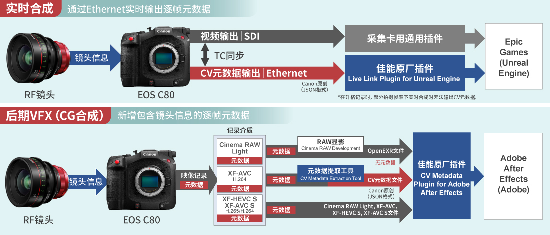通过RF卡口系统的高速通信,输出与输出影像对应的实时元数据。通过插件将视频文件的元数据导入虚拟制作应用程序,用于视频合成。
