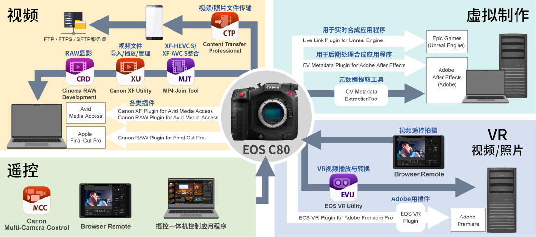 EOS C80支持统一操控多台摄影机的灵活遥控方式,如在电视台、体育、音乐等活动中控制多台摄影机。机身内置Ethernet端子和Wi-Fi功能,可通过有线或无线方式进行控制,在视频制作现场高效操控摄影机。