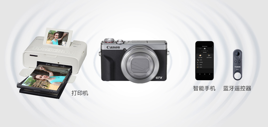 博秀PowerShot G7 X Mark III内置Wi-Fi,也支持蓝牙低功耗技术。可以与智能手机、具备Wi-Fi且兼容无线PictBridge的打印机等设备简便地进行无线连接。能够省去使用连接线的麻烦,方便在多种设备间共享,更轻松地拓展照片的乐趣。