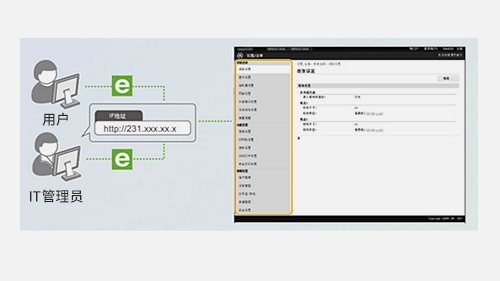 用户只需要在浏览器中输入相应的IP地址,即可通过局域网登陆打印机的远程管理界面,进行产品设置或修改。除PSW(打印机状态窗口)的功能外还可显示打印机中各纸张来源的纸张量、尺寸和类型,对网络安全进行设置等。