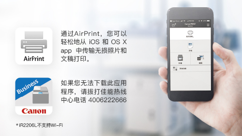 智简 iR 2206系列在移动打印中,标配产品可支持无线Wi-Fi功能,实现随时随地打印办公商务文档,打印身份证/驾驶证,既方便又快捷。应用程序可从APP Store或百度手机助手免费下载。
