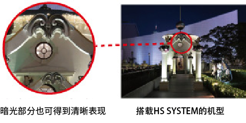 在相同的ISO感光度下,通过“HS SYSTEM”可以较大程度地减少噪点的出现。在相同的噪点水平下,可以提高ISO感光度,随着快门速度的加快,可以抑制相机抖动和主体模糊。在昏暗场景进行拍摄时,HS SYSTEM不仅能带来层次分明的暗部细节,还能使细节的边缘更加清晰。