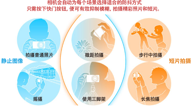 作用 | 抑制相机轻微抖动 | 减轻倾斜抖动和平行抖动 | 追随拍摄时可补偿垂直于相机移动方向抖动 | 行进拍摄短片时可减轻相机因大幅移动带来的缓慢抖动 | 远摄端拍摄短片时可减轻缓慢手抖动 | 三脚架固定相机拍摄时停止IS |