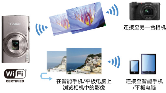 可以将相机作为接入点或使用其他接入点两种方式,通过无线网络功能连接至安卓、苹果系统的智能手机/平板电脑。只需从佳能(中国)官方网站或App Store下载安装最新的“Camera Connect”应用程序,即可轻松将相机拍摄的影像发送到智能手机/平板电脑上,或者在智能手机/平板电脑上浏览相机中的影像,选择性地保存。例如,用伊克萨斯IXUS 285 HS A在结婚典礼或活动现场拍摄后,将影像数据传输到智能手机中,再利用智能手机的Wi-Fi®功能或网络功能,上传、发送给更多人进行分享。
