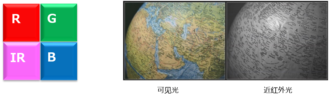 将标准色彩 CMOS 影像传感器上的绿色滤镜之一取代为此传感器中处理影像的近红外线 (NIR) 滤镜,即可分离可见与 NIR 区域。