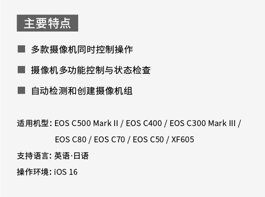 Canon Multi-Camera Control(MCC)是一款能远程操控摄像机的移动端应用程序,可实时远程浏览当前拍摄画面、查看摄像机状态、进行摄像机拍摄参数设置;轻松实现单人操控多台摄像机,最多能实现20台摄像机的同时连接与操控,有效简化多摄像机的工作流程,进一步提高工作效率。