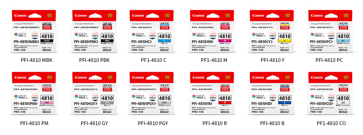| 墨盒*5 | 颜色 | 颜料墨水/12色 PFI-4810 MBK/PBK/C/M/Y/PC/PM/GY/PGY/R/B/CO | |