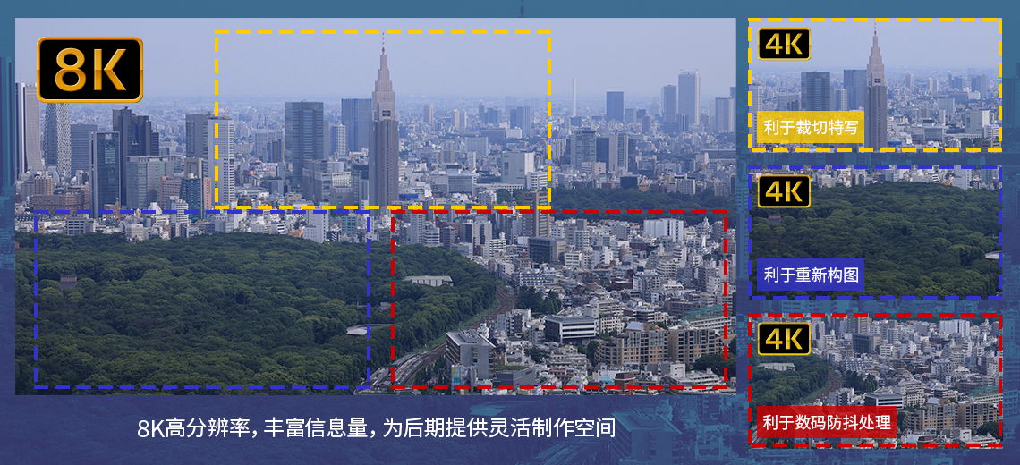 8K分辨率包含了丰富的画面细节,这就为后期对影像进行画面局部区域的剪裁等提供了广阔的空间。当使用8K素材制作主流的4K影像等时,可根据需要截取出部分画面进行二次构图,也可通过截取局部画面获得特写的效果从而为视频创作服务。且截取出的画面拥有足够的分辨率,不必通过数码手段对分辨率进行补偿,也就不会对画质造成影响。高分辨率的优势不止于此,足够的分辨率还能够支持后期通过软件进行数码防抖操作。