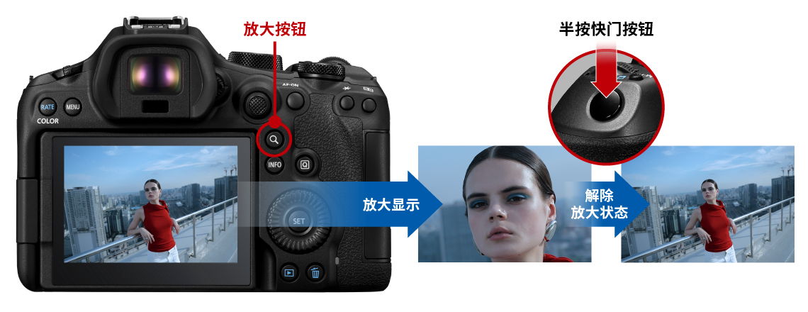 EOS R6 Mark III在手动对焦放大显示时,新增了半按快门按钮解除放大状态的功能。放大显示精确对焦后,可迅速回到拍摄状态完成拍摄。