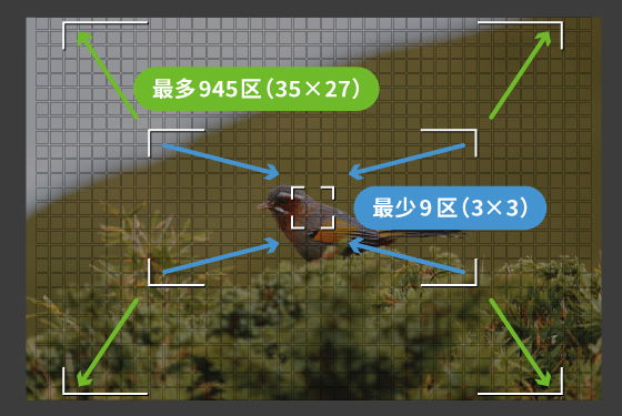 EOS R6 Mark III的灵活区域自动对焦模式下,用户可根据需要,最多使用945区(35 × 27)、最少9区(3 × 3)的范围进行对焦,共3种灵活区域模式可选。根据所拍被摄体在画面中的大小选择所需区域范围并移动到所需位置,拍摄动态被摄体的自动对焦就更加方便快捷。