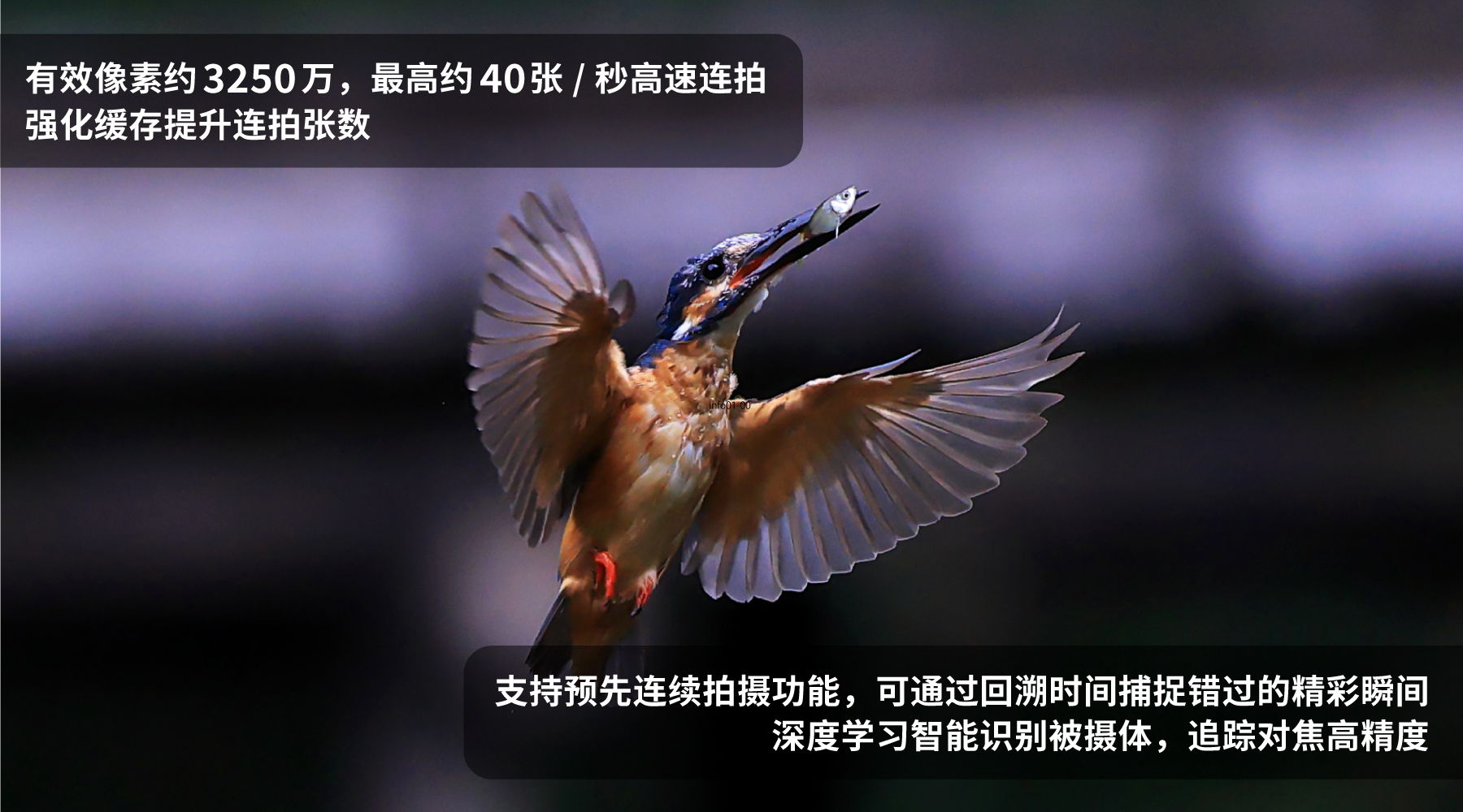 使用预先连续拍摄功能,电子快门下可记录下按下快门按钮之前最多20张连拍照片。由此,原先只能拍摄者凭感觉或经验拍摄的高难度场景,也能减少错过时机的拍摄失败,拍摄更放心。预先连续拍摄支持RAW / C-RAW / JPEG / HEIF格式图像,且不用RAW连拍模式那样拍摄后再提取照片。