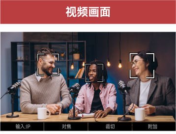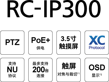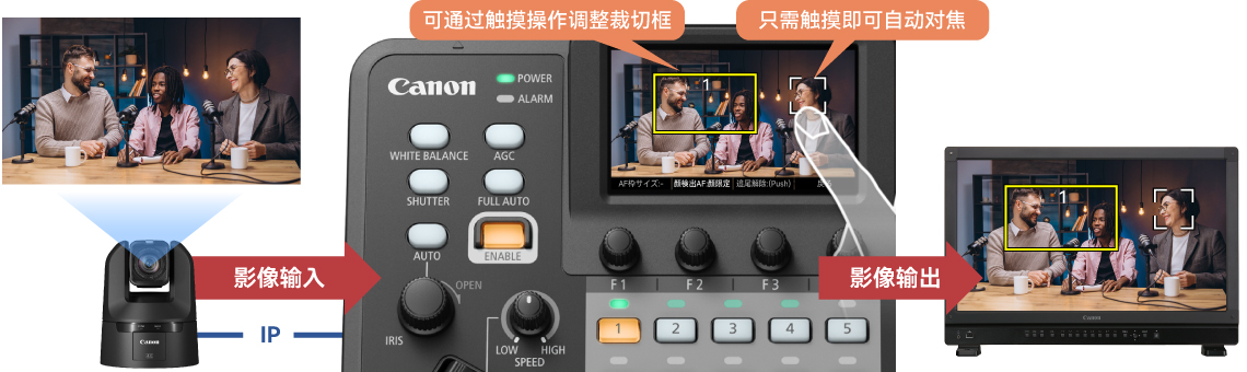 摄控一体机控制器RC-IP300支持通过触摸屏幕实现对焦与裁切功能。触控面板可显示面部检测自动对焦框,通过触摸即可快速指定对焦对象。触控屏可显示裁切框,可通过触摸操作对裁切框进行选择、移动以及尺寸调整。