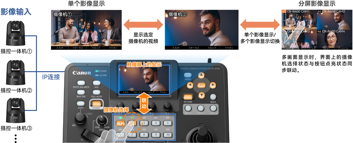 支持IP图像输入,可在触摸屏上实时显示并操作摄像机画面。根据所选操作的摄像机,触摸屏上显示的画面会自动切换,即使在频繁切换摄像机的场景下,也能准确选出需要操作的那一个 。触摸屏最多可同时显示9个分屏画面,便于预览确认后精准选定操作目标。