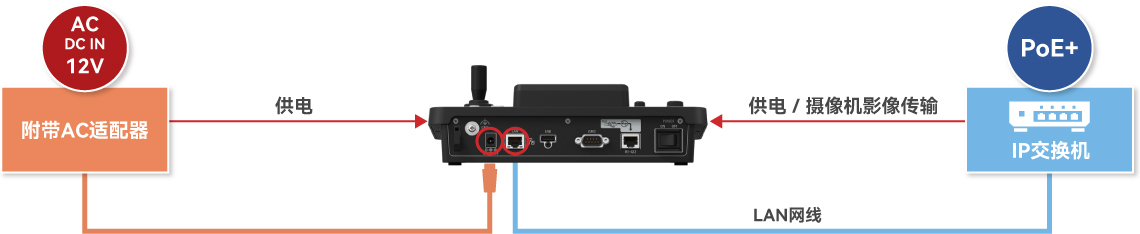 支持12V直流电源供电方式;同时也支持PoE供电,仅用一根LAN网线即可实现供电,施工省时,降低成本。