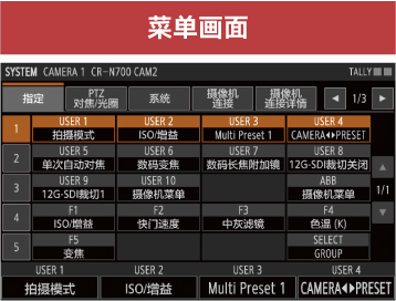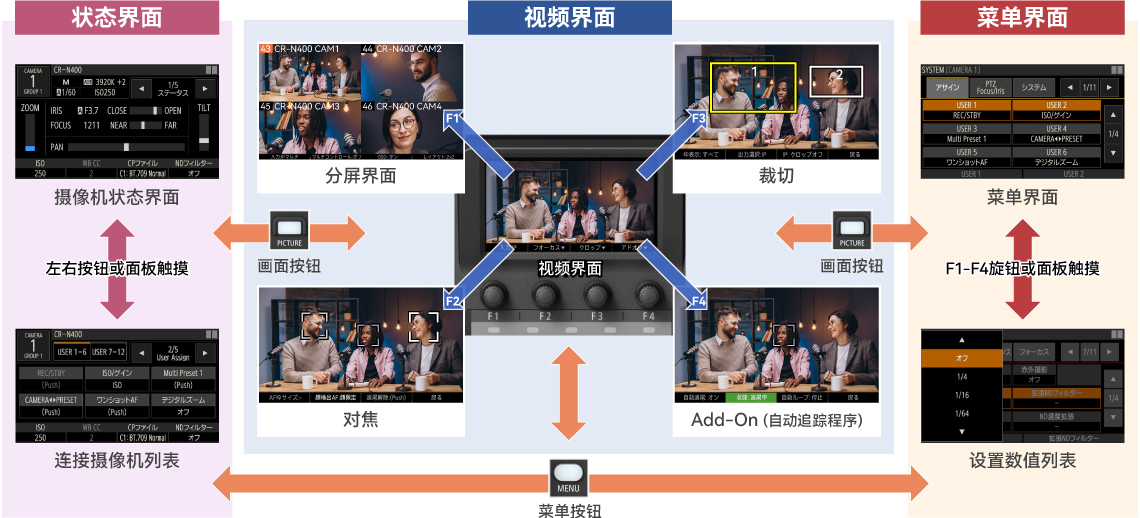 可通过机身按钮或面板触摸完成状态与菜单画面的切换及各项操作。按下“PICTURE”(画面)按钮,即可快速进行摄像机视频画面与菜单界面的切换。