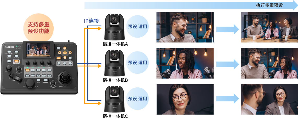 系统支持最多200台摄像机同步执行相同动作或配置。支持多预设功能,可调用各摄像机预设的任意编号,组合不同视角,在多机位拍摄时快速执行预设拍摄方案。