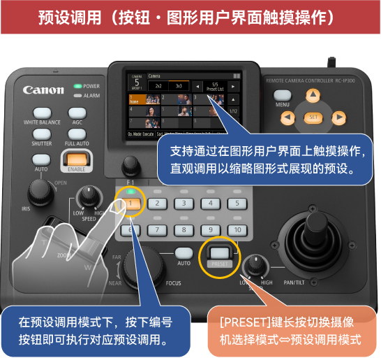摄像机[PRESET]按键可通过模式切换实现预设调用功能,确保操作准确执行。已注册预设支持缩略图确认,有效降低误操作风险。执行跟踪功能的同时支持操作摄像机的切换,便于多机位协同控制。