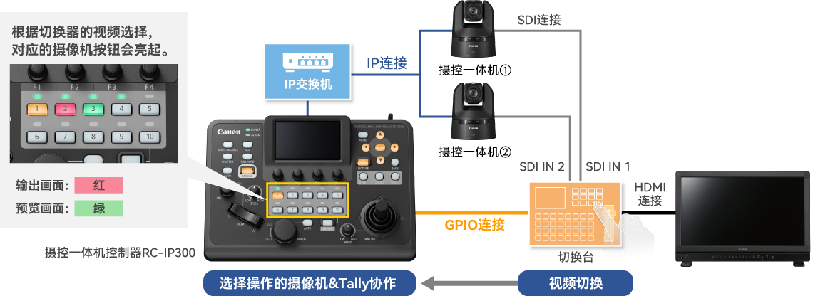 通过GPIO(输入/输出接口)连接切换器,可实现视频源与摄像机选择同步。还能将切换器Tally状态同步至控制器,输出画面对应按钮显示红色,预监画面对应按钮显示绿色。