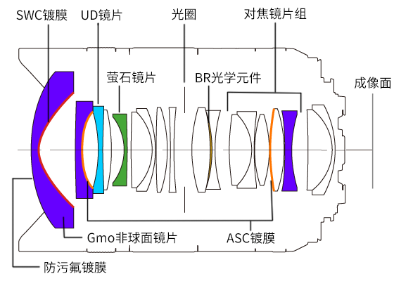 RF14mm F1.4 L VCM的光学构成非常奢华,有GMo(玻璃模铸)非球面镜片、UD(超低色散)镜片、BR光学元件(蓝色光谱折射光学元件),并配合高技术的镜片镀膜。可以说是汇集了佳能光学技术的结晶。