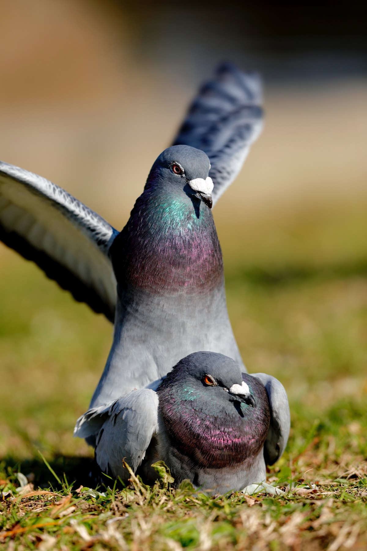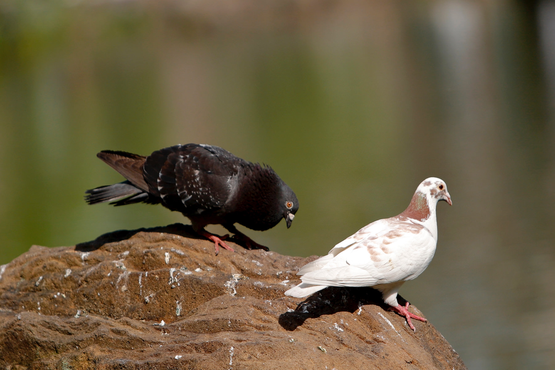 我们通常所说的“鸽子”,就是原鸽,它们是从人工驯养状态逃逸后重新回归野生的鸟类。其羽色和花纹存在大量变异,而最接近原始野生型的个体通体灰色,翅膀上有两道黑色横纹,胸部带有绿紫色金属光泽。成鸟上喙基部有白色肉突,幼鸟则不明显(见上图)。雄鸟除繁殖期会发出轻柔低沉的“咕咕 —— 噗噗”声外,平时很少鸣叫;雏鸟则会发出尖锐的“吱 ——”声。