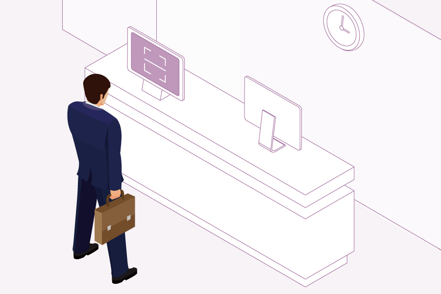訪問顧客が自ら登録・退出を行い、受付の無人化を実現します。