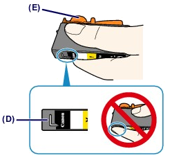 - 请勿推动墨水盒的侧面。 如果推动L形气孔(D)阻塞的墨水盒的侧面,墨水可能会溅出。
