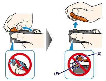 - 请勿触摸橙色保护盖(E)或裸露的墨水端口(F)的内侧。 如果触摸这些区域,墨水可能会弄脏双手。