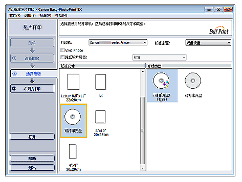 在页设置屏幕将打印类型选择为可打印光盘时,出现