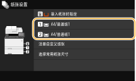 - 注册了默认纸张设置后,装入纸张时将不会显示纸张设置画面,并且将一直使用相同的设置。如果在未改变纸张设置的情况下装入不同尺寸或类型的纸张,本机可能无法正常打印。为了避免此问题,请在步骤 3 中选择 <装入纸张时指定>,然后再装入纸张。