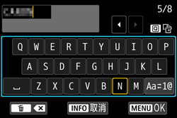 | 输入文本 | 在底部区域中,按 < > < > 或 < > < > 键选择字符,然后按 < > 将其输入。通过参阅屏幕右上方的 [*/*],可以查看已经输入了多少字符,以及可以继续输入多少字符。 |